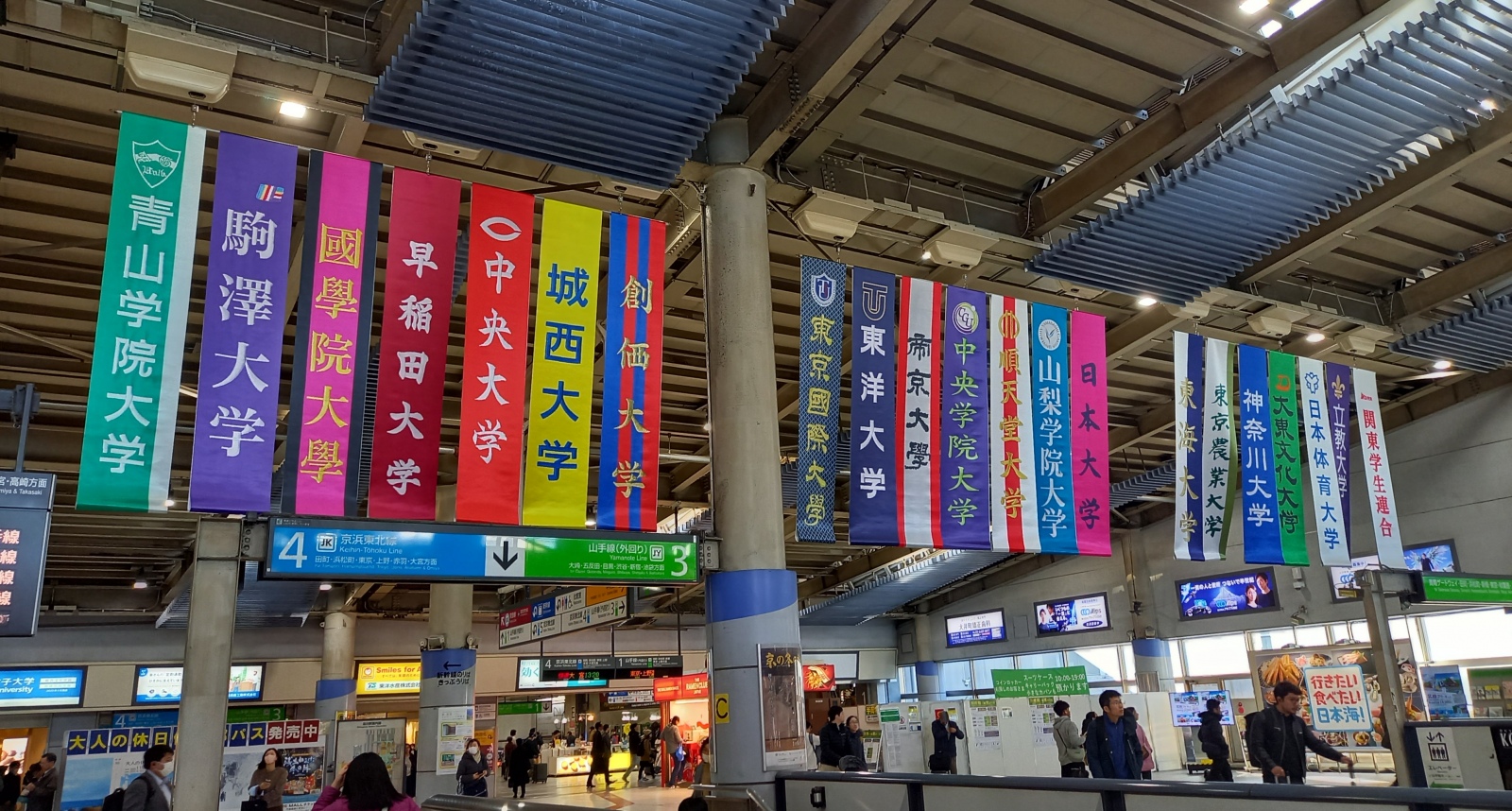 JR品川駅構内、年明けの箱根駅伝出場大学、校名のノボリ?